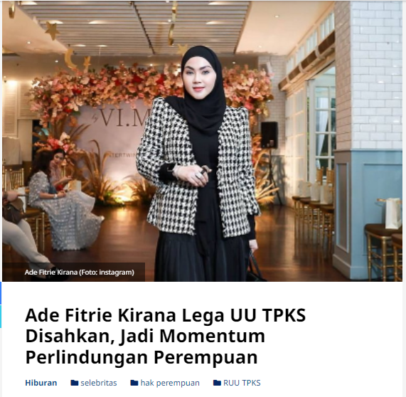 Rancangan Undang-Undang Tindak Pidana Kekerasan Seksual (RUU TPKS) resmi disahkan menjadi Undang-Undang. Keputusan ini disambut banyak selebriti, termasuk artis Ade Fitrie Kirana.
