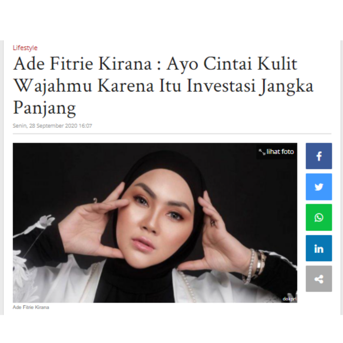 Baca Selengkapnya: Ade Fitrie Kirana : Ayo Cintai Kulit Wajahmu Karena Itu Investasi Jangka Panjang